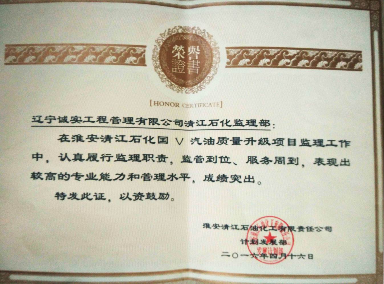 2016年淮安清江石化國V汽油質(zhì)量升級項(xiàng)目獎(jiǎng)狀