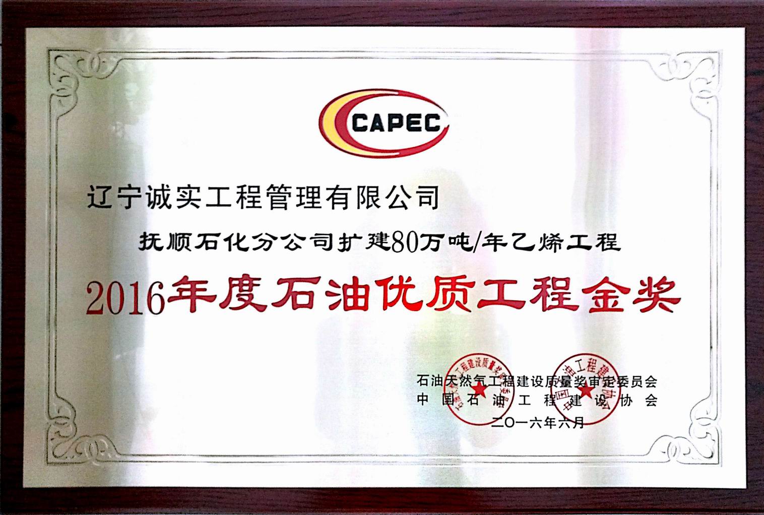 2016年石油優(yōu)質(zhì)工程金獎(撫順石化分公司擴建80萬噸/年乙烯工程)