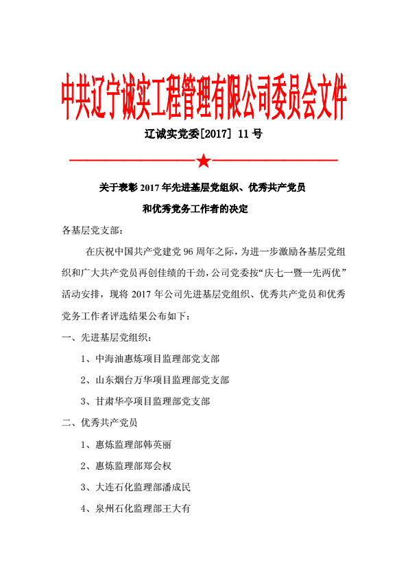 為慶祝中國(guó)共產(chǎn)黨建黨96周年,公司黨委于2017年6月30日下午在公司一樓會(huì)議室召開(kāi)了慶祝建黨96周年暨“一優(yōu)兩先”表彰視頻大會(huì)。公司機(jī)關(guān)、撫順各項(xiàng)目監(jiān)理部及在撫的黨員同志在主會(huì)場(chǎng)參加了大會(huì),中海油惠州項(xiàng)目監(jiān)理部黨支部、甘肅華亭項(xiàng)目監(jiān)理部黨支部、寧夏石化項(xiàng)目監(jiān)理部黨支部、中化泉州項(xiàng)目監(jiān)理部黨支部、廣西石化項(xiàng)目監(jiān)理部黨支部、蘭州石化項(xiàng)目監(jiān)理部黨支部、內(nèi)蒙古君正項(xiàng)目監(jiān)理部黨支部、神華寧煤項(xiàng)目監(jiān)理部黨支部、煙臺(tái)萬(wàn)華項(xiàng)目監(jiān)理部黨支部設(shè)立視頻分會(huì)場(chǎng)。黨委委員馬駿主持了視頻大會(huì)。首先,公司黨委副書(shū)記馮玉琢同志宣讀了“一優(yōu)兩先”表彰決定。接著,黨委書(shū)記孫學(xué)良結(jié)合公司實(shí)際做了慶祝建黨96周年的講話。最后全體黨員重溫的入黨誓詞,進(jìn)行入黨宣誓。
