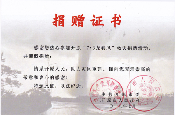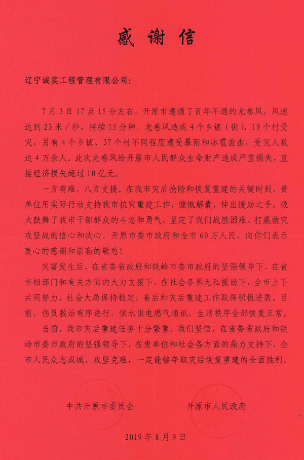 2019年7月3日一場(chǎng)可怕的龍卷風(fēng)席卷了遼寧省開原市,據(jù)初步統(tǒng)計(jì),這場(chǎng)災(zāi)害共造成6人死亡、190余人受傷、2.8萬人受災(zāi),房屋受損6451戶,農(nóng)業(yè)大棚受損25棟,農(nóng)田受災(zāi)14.6萬畝,100余萬平方米廠房遭受嚴(yán)重?fù)p壞,造成直接經(jīng)濟(jì)損失約10.75萬元。災(zāi)情發(fā)生后,省委、省政府及省住建廳領(lǐng)導(dǎo)高度重視,號(hào)召全省監(jiān)理企業(yè)為此次災(zāi)情捐款。龍卷風(fēng)無情,人有情。為了幫助受災(zāi)同胞共渡難關(guān),我單位積極響應(yīng)省委、省政府、省建設(shè)廳以及省協(xié)會(huì)的號(hào)召,在第一時(shí)間捐款3000元。參與此次捐款的省監(jiān)理單位共計(jì)近30家,捐款數(shù)額從500元至20000元不等。事后,開原市委、開原市政府為我單位頒發(fā)了感謝信以及捐贈(zèng)證書。
