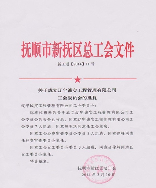 經(jīng)過近兩個月的籌備,誠實(shí)工會現(xiàn)已履行完畢各個籌備程序,撫順市新?lián)釁^(qū)總工會已正式批準(zhǔn)成立遼寧誠實(shí)工程管理有限公司工會委員會。公司工會由7名委員組成,下設(shè)經(jīng)費(fèi)審查委員會和女工委員會。公司工會將根據(jù)機(jī)關(guān)及項目部的實(shí)際情況,相應(yīng)成立工會分會和工會小組,發(fā)揮工會在企業(yè)中的積極作用,為企業(yè)的發(fā)展做出貢獻(xiàn)。