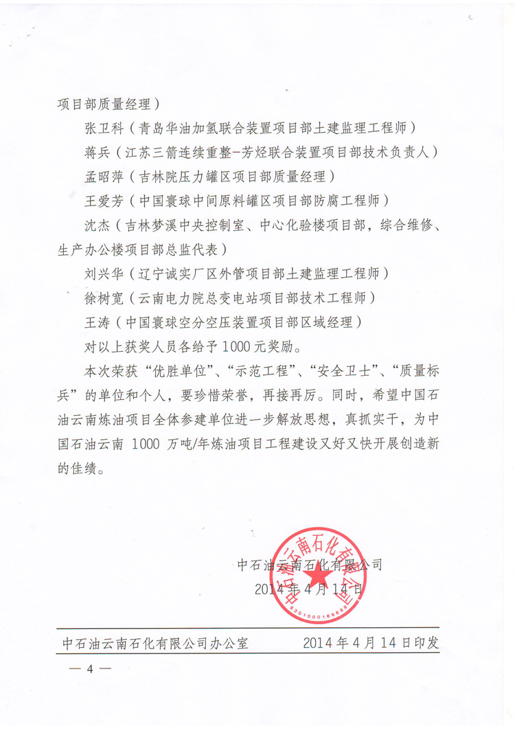 我公司榮獲中國(guó)石油云南1000萬(wàn)噸/年煉油項(xiàng)目2014年3月份“優(yōu)勝單位”稱(chēng)號(hào)