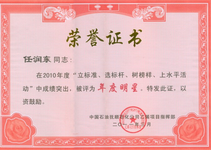 任潤東同志被中國石油撫順石化公司乙烯項目指揮部評為年度明星