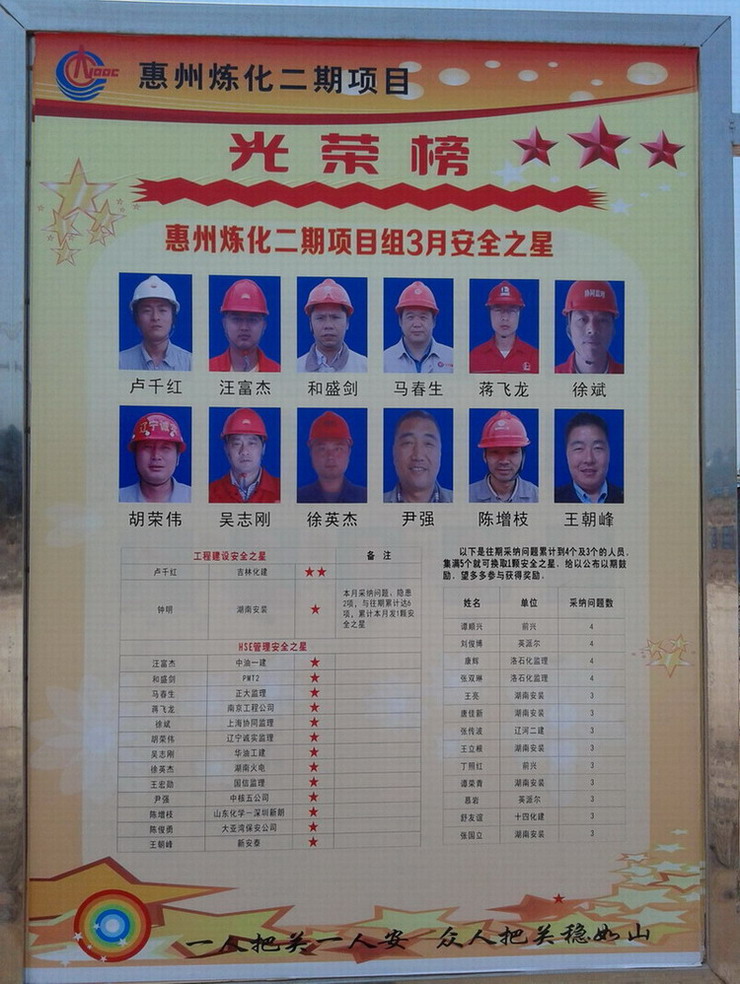 遼寧誠實工程管理有限公司中海石油惠州煉化項目監(jiān)理部HSE監(jiān)理工程師胡榮偉,喜登業(yè)主中海石油煉化公司惠州煉化分公司設立的三月安全之星光榮榜,體現(xiàn)了中海石油煉化公司惠州煉化分公司對我公司監(jiān)理服務的信任與認可。